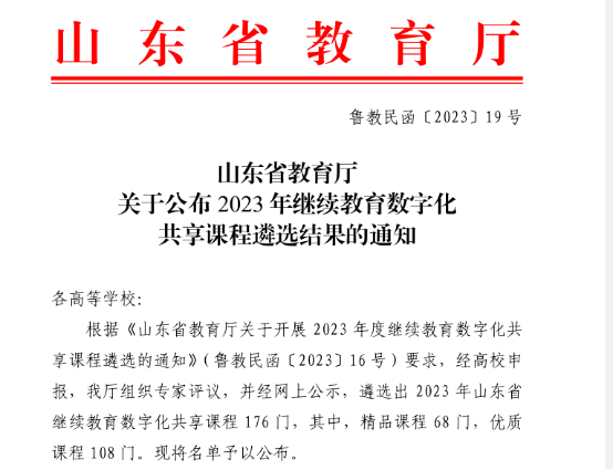 根据《山东省教育厅关于开展2023年社区教育优秀课程资源遴选活动的通知》、《山东省教育厅关于开展 2023 年度继续教育数字化共享课程遴选的通知》要求,继续教育学院(社区艺术大学)积极组织学校教师申报社区教育课程及继续教育数字化共享课程,1门入选省级社区教育优秀课程,1门入选继续教育数字化共享精品课程。