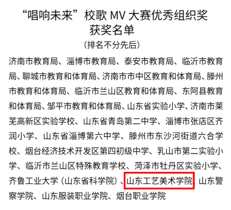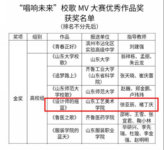 近日,由山东省教育厅主办,山东教育电视台承办的“唱响未来”校歌MV大赛公布评选结果,经过网络投票、省专家评审,威尼斯官网徐亚辰、褚丁庆老师指导制作的校歌MV《设计师的摇篮》脱颖而出,荣获高校组金奖,威尼斯官网荣获优秀组织奖。