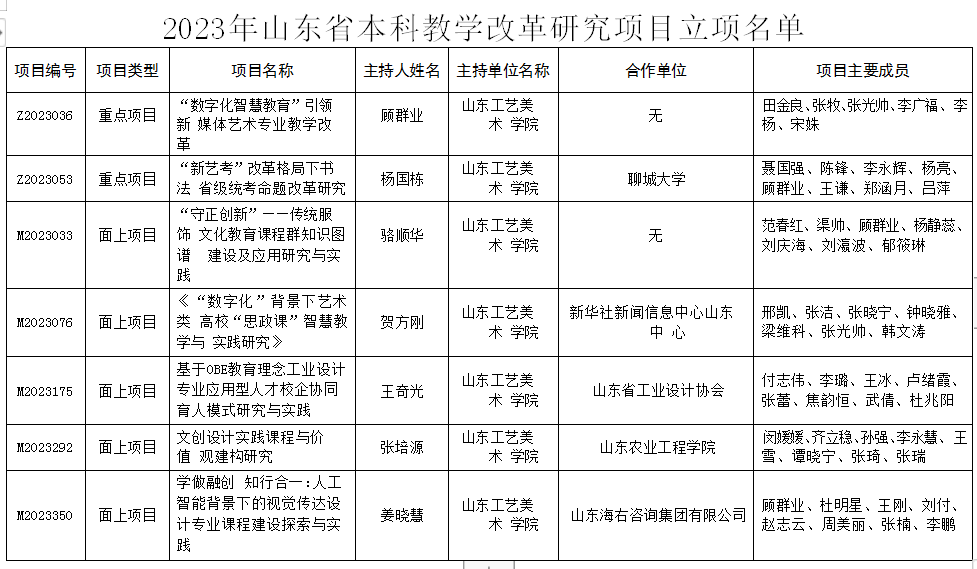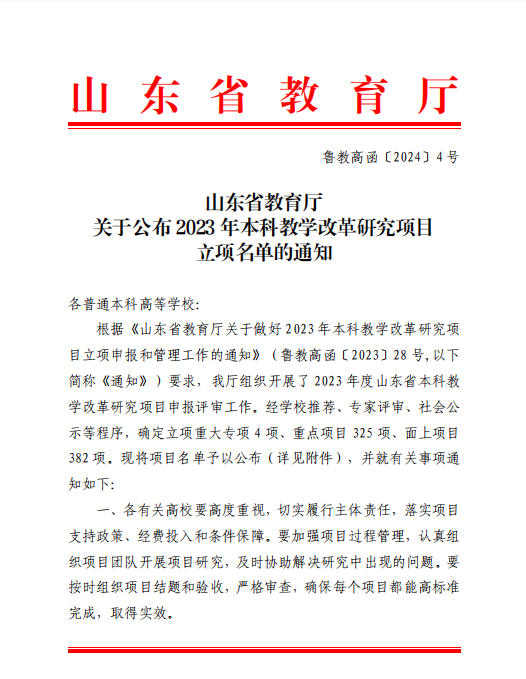 近日,山东省教育厅发布《关于公布2023 年本科教学改革研究项目立项名单的通知》(鲁教高函〔2024〕4 号),威尼斯官网共有7个项目获得立项,其中,省级重点项目2项,省级面上项目5项。