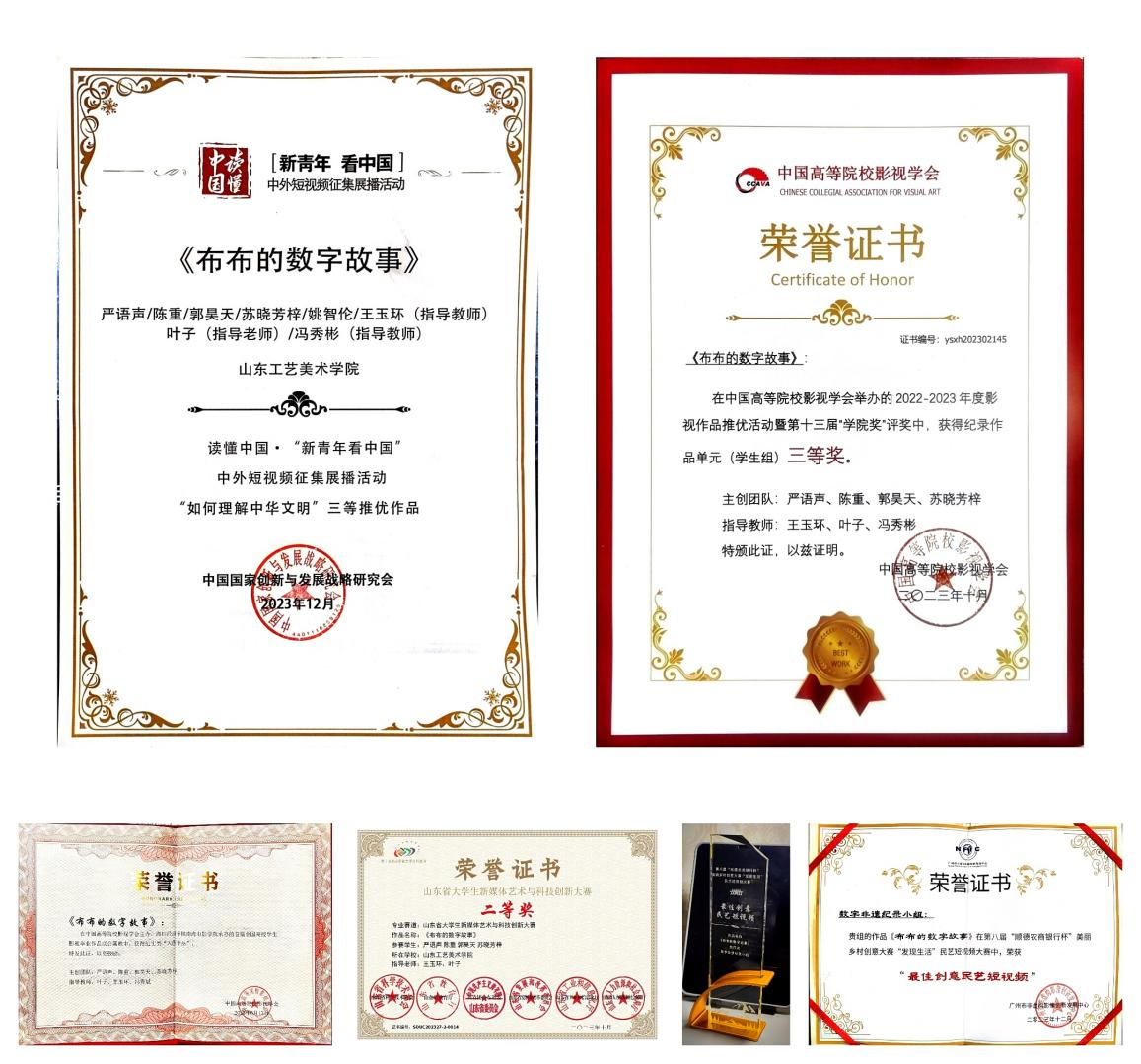 作品兼具专业高度与思想深度,既立足中国,实现个人梦想与家国情怀的同频共振;又着眼国际,传达当今局势下的中国担当。先后获得中科院国创会、国家地理、央视网、中国纪录片网主办的“读懂中国·新青年看中国中外短视频征集”的“三等推优”、中国高等院校影视学会“学院奖”三等奖、山东省科协“大学生新媒体艺术与科技创新大赛”二等奖、中国高等院校影视学会“毕业作品联合展映纪录片单元”入围作品奖、广州市非虚构影像创新发展中心“发现生活民艺短视频”最佳创意奖、2023年山东工艺美院设计博览会“优秀毕业作品”等。