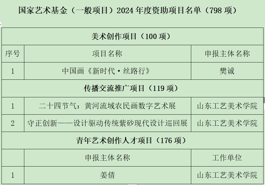 集体项目《二十四节气:黄河流域农民画数字艺术展》《守正创新——设计驱动传统紫砂现代设计巡回展》获批传播交流推广项目资助,樊诚老师的中国画《新时代·丝路行》获批美术创作资助项目,姜倩老师获批青年艺术创作人才资助项目。