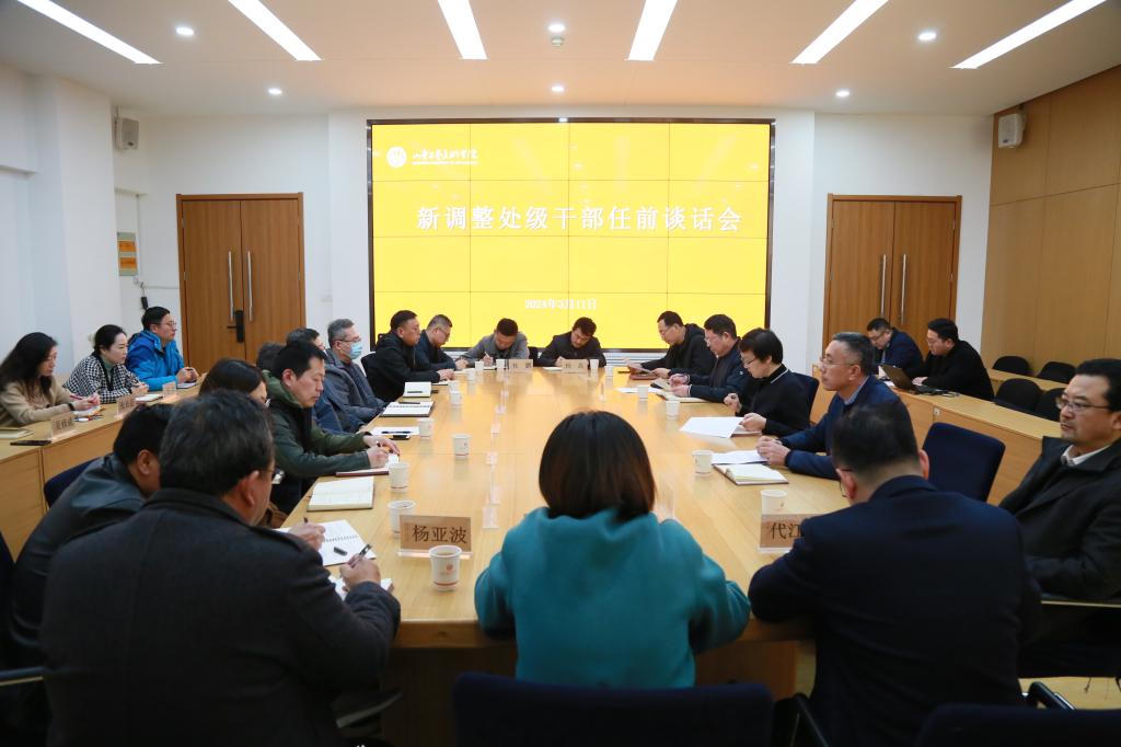 王晓娟与新任职处级干部进行集体谈话。她指出,本次处级干部调整,是党委着眼推进学校事业持续健康发展,在深入调研、反复酝酿的基础上,通盘考虑、审慎研究作出的重要决定。