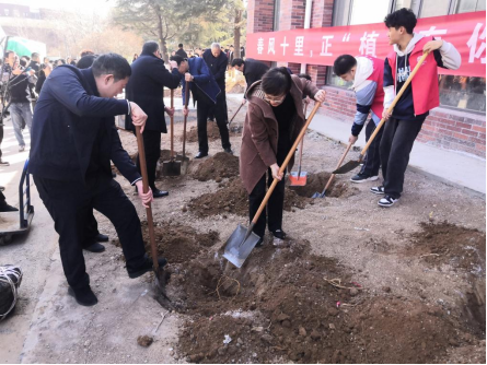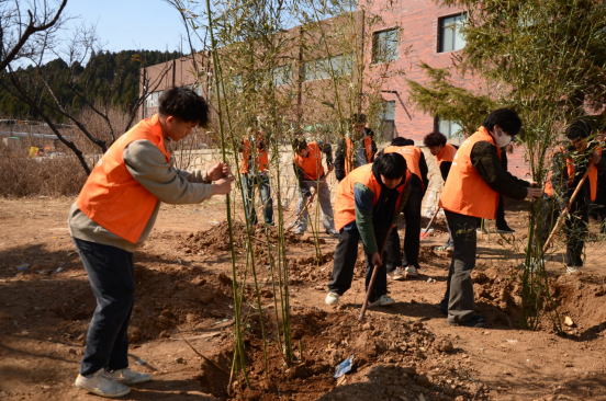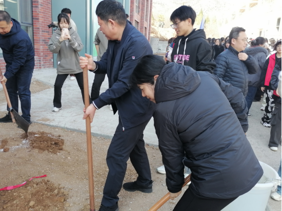 学校领导及来自各部门、二级学院的师生们一起挖树坑、搬树苗、施肥、浇水,分工协作、互相配合,热火朝天地种下一株株树苗,为学校建设增添新绿。