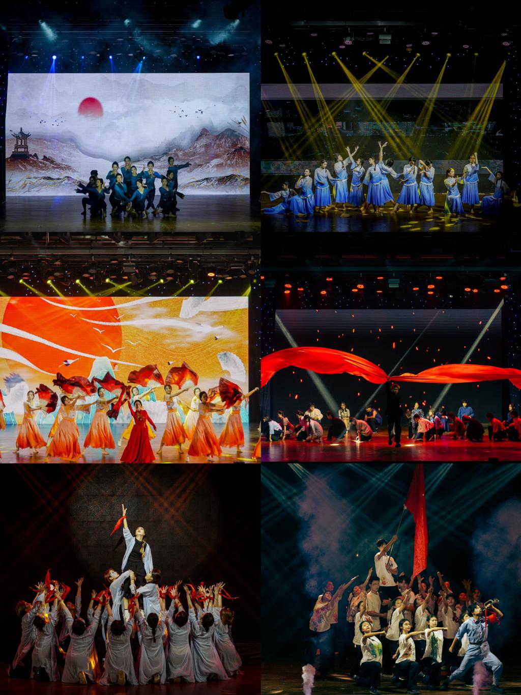 第二篇章“红色传承篇”,带领我们体会古典舞与现代舞的完美融合,延续革命先烈的赤诚之心,感悟红色精神的薪火相传。应用设计学院的舞蹈《砥砺前行》在红旗飘扬下点燃革命热血与希望;造型艺术学院的舞蹈《烽火青春》带领我们穿越时空,共同追忆那段难以忘怀的光辉历程;基础教学部的舞蹈《少年说》展现一代代青年人在承接历史使命之路上始终向前;数字艺术与传媒学院舞蹈《燎原》在党的带领下,无数如燎原之火般的伟大时刻竞相绽放。