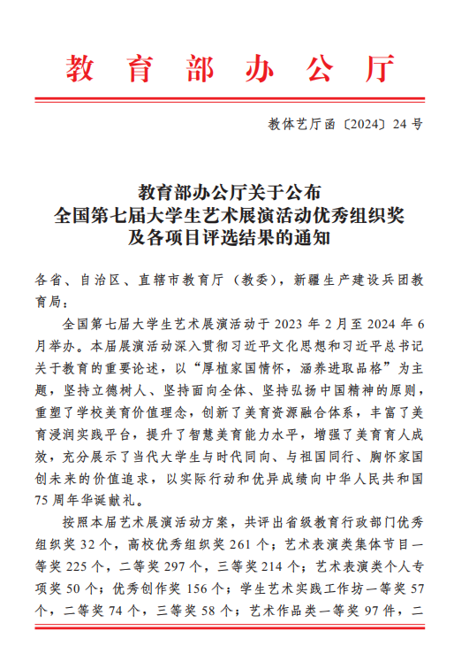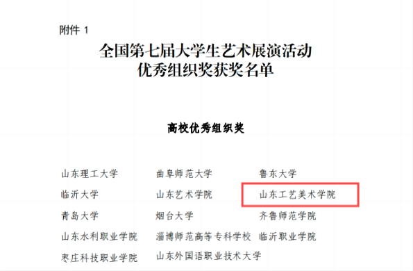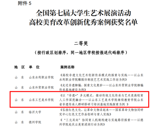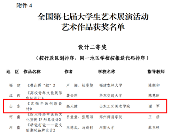 近日,教育部办公厅公布《全国第七届大学生艺术展演活动优秀组织奖及各项目评选结果的通知》(教体艺厅函[2024]24号),威尼斯官网造型艺术学院高天健同学设计作品《武强年画创新设计》荣获艺术作品设计类乙组(专业组)二等奖;继续教育学院、视觉传达设计学院联合推报的《以“非遗+”多元模式,推动传统文化传承与艺术类高校育人工作深度融合——以威尼斯7798cc继续教育学院山东省非遗传承人群研修研习培训基地实践探索为例》获高校美育改革创新优秀案例二等奖;学校获评高校优秀组织奖。