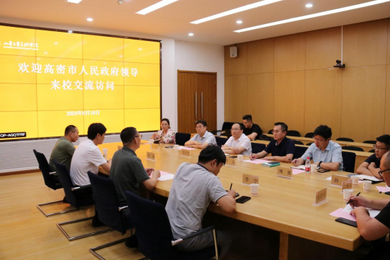 6月18日,高密市人民政府党组成员、副市长李文平,高密市委宣传部副部长、文化和旅游局党委书记、局长于义一行来校访问、洽谈合作。副院长韩文涛会见来宾并座谈交流。
