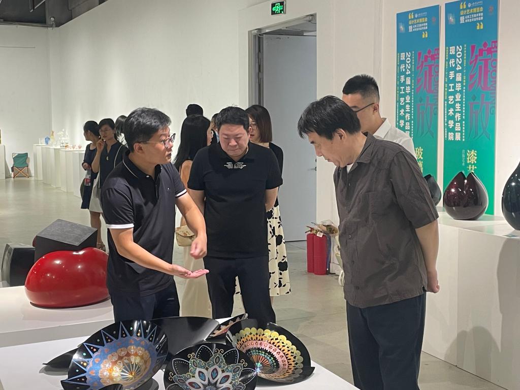 现代手工艺术学院副院长惠岩:现代手工艺术学院展区以“绽放”为主题,分为长清校区美术馆和图书馆一楼艺术空间两个展区,共展示了2024届工艺美术、公共艺术和陶瓷艺术设计三个专业本科毕业生的172套设计作品,将学生在工艺美院学习成长的经历呈现在毕业创作中,每一件作品都见证着他们的成长与绽放。