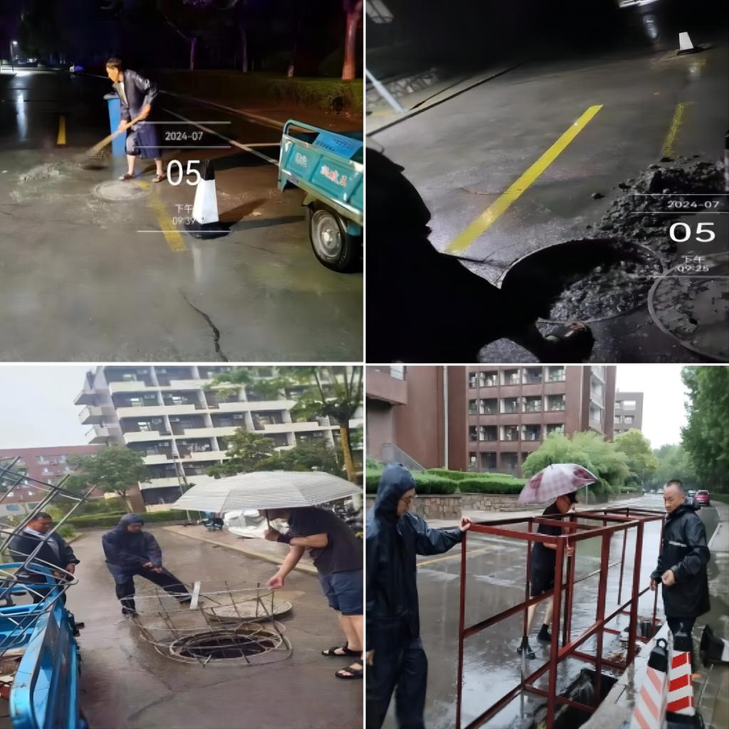 工作人员冒雨用垃圾夹、铁锹等工具对体积较大的垃圾进行清掏,争分夺秒穿梭在校内各处开展清淤排涝工作,并在危险地带设置警示牌、拉起危险地段警戒线,及时排查校内所有区域的窨井,疏通被垃圾堵塞的井盖,保障排水通畅。
