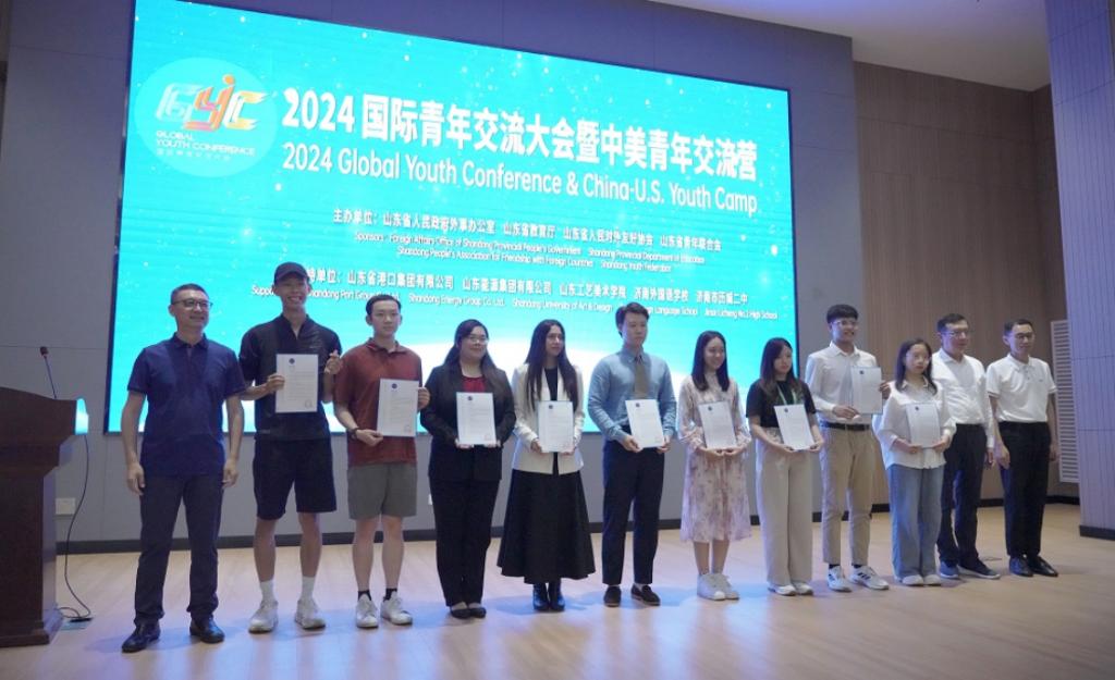 林海滨、韩文涛、于沉涛向中外青年代表颁发了2024国际青年交流大会暨中美青年交流营证书。