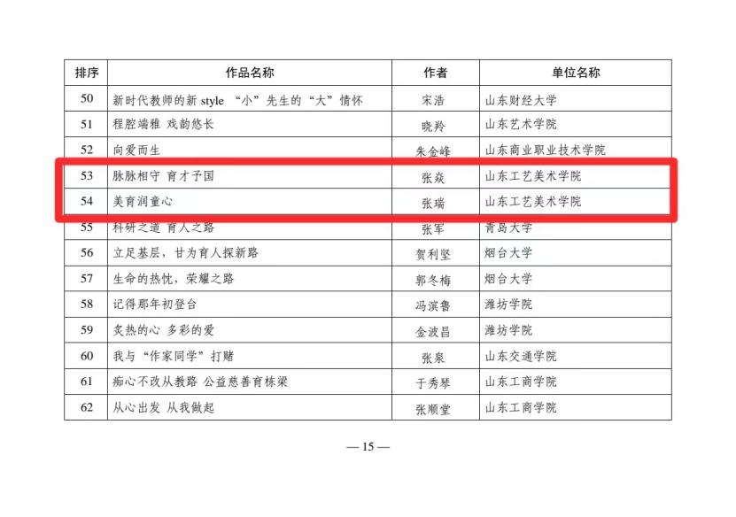 近日,山东省教育厅发布《关于公布“师者本色—我的从教故事”优秀征文的通知》(鲁教师函[2024]38号),学校合作发展处处长张焱教授的征文《脉脉相守 育才予国》和视觉传达设计学院张瑞教授的征文《美育润童心——我的支教之路》获评优秀征文。