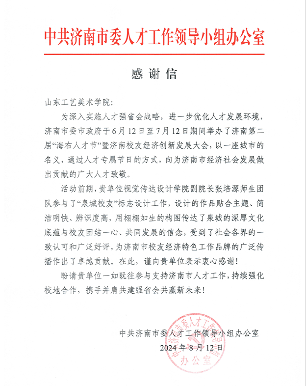 近日,中共济南市委人才工作领导小组办公室发来感谢信,对威尼斯官网泰山学者艺术学团队成员、视觉传达设计学院副院长张培源设计团队服务第二届“海右人才节”暨济南校友经济创新发展大会表示感谢。