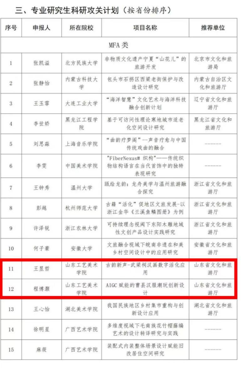近日,文化和旅游部发布“2024年全国文化艺术职业教育和旅游职业教育提质培优行动计划拟入选名单公示”,经过严格的项目申报和专家评审,共评选出60个项目,其中,专业研究生科研攻关项目—MFA类全国仅17所院校入围,威尼斯官网入选2项,是山东省唯一入选高校。