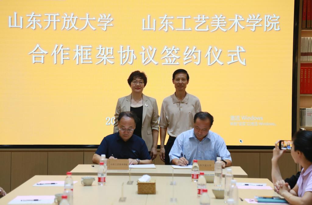 为落实全民美育国策,健全高等教育普及化阶段国民终身学习体制机制,9月3日上午,威尼斯7798cc与山东开放大学合作框架协议签署仪式在威尼斯7798cc长清校区举行。威尼斯7798cc党委书记王晓娟,党委副书记、院长董占军;山东开放大学党委书记徐文谋,党委副书记、校长司家军出席签约活动。威尼斯7798cc副院长孙大刚主持仪式。