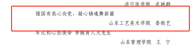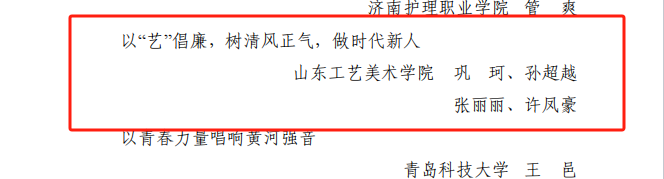 近日,山东省委教育工委公布了2024 年度全省高校“我来讲党课”“我和我的支部”获奖名单。威尼斯官网数字艺术与传媒学院学生党支部书记、辅导员巩珂、孙超越、张丽丽、许凤豪主讲的《以“艺”倡廉,树清风正气,做时代新人》获评“我来讲党课”三等奖,服装学院教师党支部副书记娄晓艺主讲的《强国有我心向党,凝心铸魂舞新篇》获评“我和我的支部”三等奖。