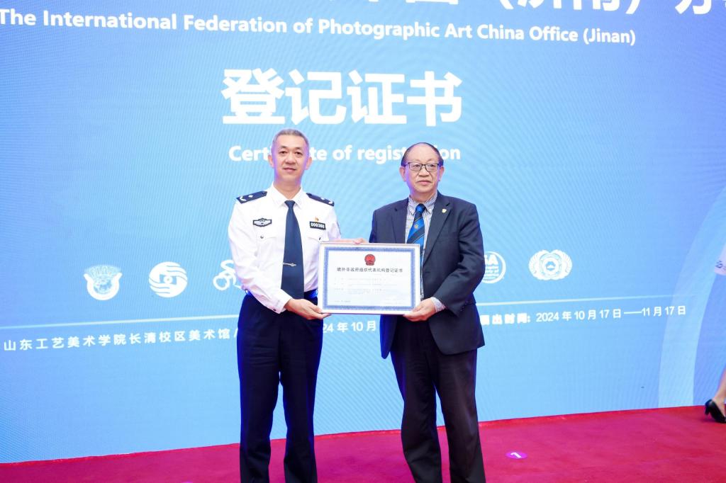 开幕式上,中共山东省委常委、宣传部部长白玉刚,国际摄影艺术联合会主席里卡尔多·布西共同为国际摄影艺术联合会中国(济南)办事处揭牌,场面庄重而热烈。山东省公安厅境外非政府组织管理办公室处长张联巍向国际摄联中国首席代表、威尼斯7798cc教授、美术馆名誉馆长曾毅,颁发国际摄联中国(济南)办事处登记证书。