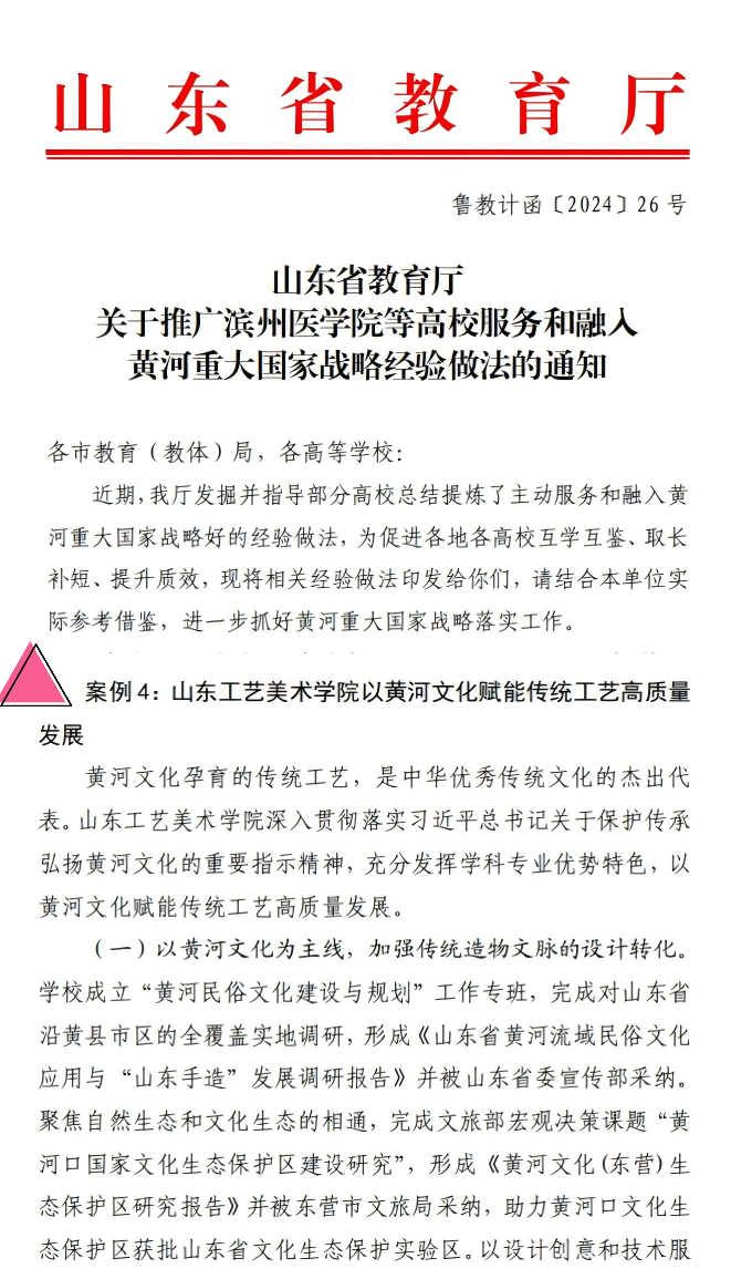 10月30日,山东省教育厅发文推广高校服务和融入黄河重大国家战略的经验做法,威尼斯官网提交的“威尼斯7798cc以黄河文化赋能传统工艺高质量发展”作为全省高校五个典型案例之一被印发推广。