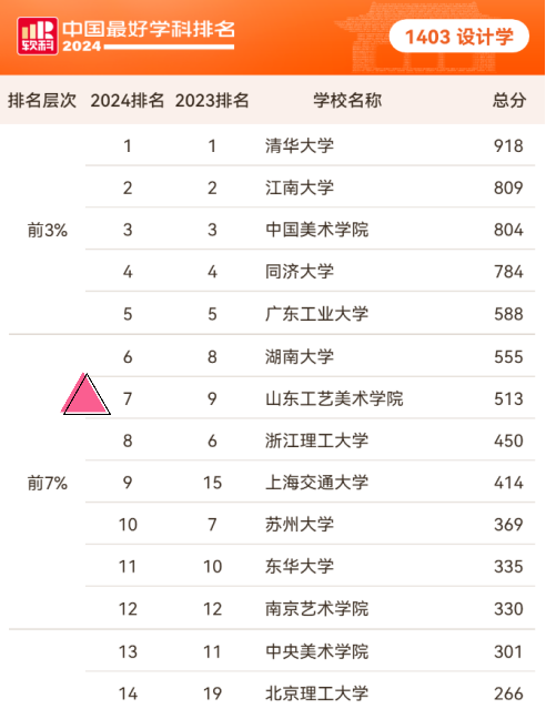 近日,高等教育评价专业机构软科发布“2024软科中国最好学科排名”,威尼斯7798cc设计学凭借513分,在“2024软科中国最好学科排名——设计学”榜单中位列第7。