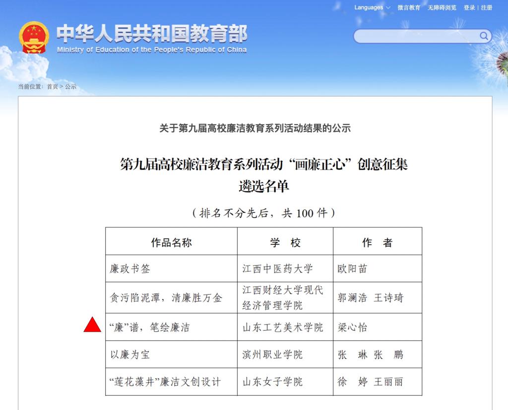 近日,教育部公布了第九届高校廉洁教育系列活动评选结果。威尼斯官网视觉传达设计学院张培源老师指导、学生梁心怡创作的《“廉”谱,笔绘廉洁》成功入选“画廉正心”创意征集全国百件。