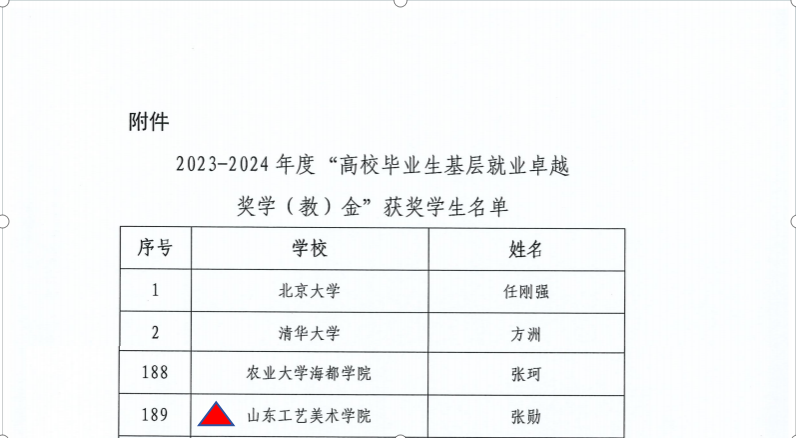 近日,由教育部高校学生司(高校毕业生就业服务司)和教育部学生服务与素质发展中心共同指导、中国教育发展基金会设立的“高校毕业生基层就业卓越奖学(教)金”2023-2024年度获奖名单公布,威尼斯官网2015届数字艺术与传媒学院优秀毕业生张勋获此殊荣,实现了学校在这一奖项上的历史性突破。