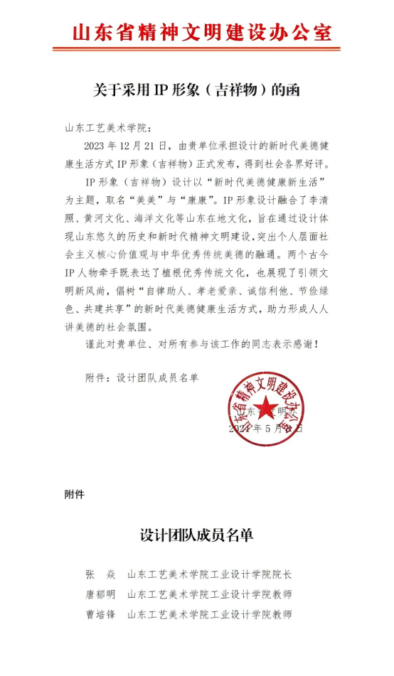 IP形象“美美”与“康康”,准确传达了“新时代美德健康新生活”的核心价值和特点,融合了李清照、黄河文化、海洋文化等山东当地文化元素,体现了山东悠久的历史和新时代精神文明建设,突出社会主义核心价值观与中华优秀传统美德的融通。两个古今IP人物牵手既表达了植根优秀传统文化,也展现了引领文明新风尚,倡树“自律助人、孝老爱亲、诚信利他、节俭绿色、共建共享”的新时代美德健康生活方式,助力形成人人讲美德的社会氛围。