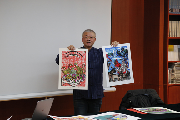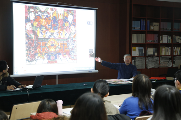 杨永智教授首先展示了丰富的作品图片,带领大家回顾年画的发展历程,探寻年画的历史渊源,介绍台湾近年来年画研究的主要成果及现状;随后,杨教授分析了社会发展不同时期,年画的题材种类、文化内涵以及文化价值的多样性,围绕“九世同居”、“阖家欢乐”、“开台国兴公”等经典年画作品讲述了年画的象征意义以及产地分布、制作工艺等。杨教授指出,年画是中国画的一种,是汉族民间艺术之一,亦是常见的民间工艺品之一,希望同学们保持民族工艺美术的自豪感与自信心,传承年画艺术,弘扬民族文化。