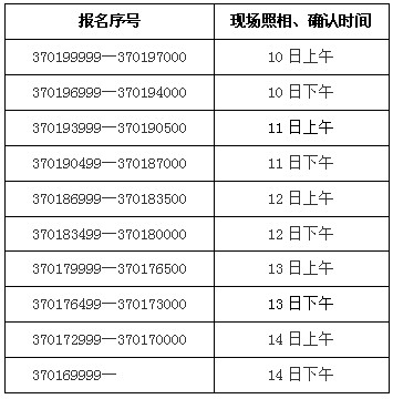 1.报考点选择3701济南市招生办公室的考生请于11月10日—14日8:30—16:30持本人第二代居民身份证、学历证书(普通高校、成人高校、普通高校举办的成人高校学历教育应届本科毕业生持学生证)和网上报名编号到济南皇亭体育馆(济南市泉城路15号)进行现场照相并确认报名信息。因报考点人数较多,请严格遵守以下现场确认时间安排: