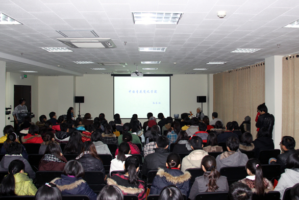 孙长林先生结合具体实物及图片,从“什么是青花瓷”、“青花瓷的成熟年代”、“青花瓷身价与审美功能”、“怎样鉴定青花瓷”四个方面对青花瓷进行了阐释。青花瓷,又称“蓝花”、“白釉青花”或“白地青花瓷器”,始于唐代,成熟于元代,繁荣于明代,盛衰于清代。“鬼谷下山”、“萧何月下追韩信”等具有历史和文化内涵的青花瓷作品,其艺术价值和经济价值都无可估量。大家最感兴趣的莫过于鉴别青花瓷的方法,孙长林先生从朝代、制作者、造型、绘画和构图、胎、釉、青花呈色以及其它工艺特点等多方面介绍了青花瓷的鉴别方法。孙长林先生结合自身收藏经历,用图文并茂的方式向大家展示了一个鲜明、生动的青花瓷世界——“白釉青花一火成,花从釉里透文明。可参造化先天妙,无极由来太极佳。”使听众深层次地感悟到青花瓷重要的历史价值和精神价值,这种文化素养是艺术学子需要重点领会和掌握的。