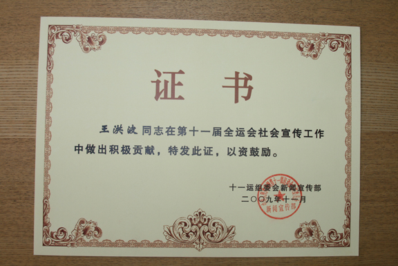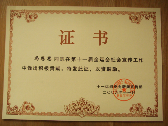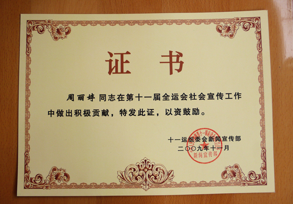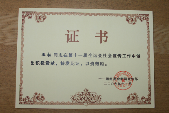 2009年11月,中华人民共和国第十一届运动会组委会新闻宣传部授予威尼斯官网设计艺术学研究生周丽婷、刘青、王洪波、冯思思、王拓“第十一届全运会社会宣传工作积极贡献”奖。