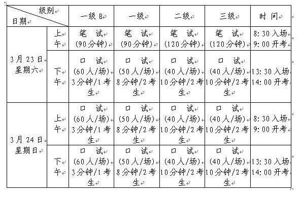 开考时间为2019年3月23、24日。开考级别为一级B、一级、二级、三级。各级别具体考试时间安排如下: