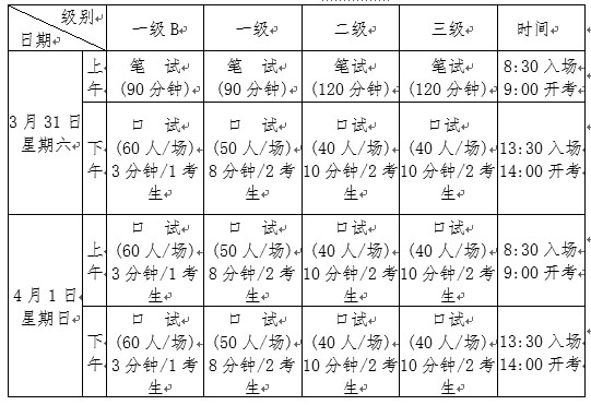 开考时间为2018年3月31日至4月1日。开考级别为一级B、一级、二级、三级。各级别具体考试时间安排如下: