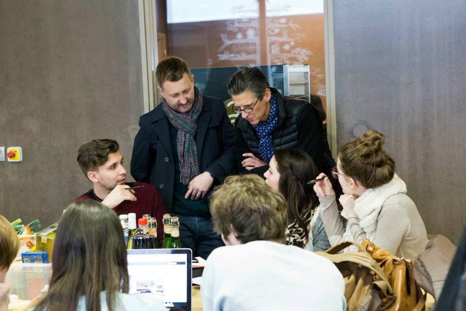 而这门课最有意思的地方在于其间一个周的moke up课程。周一全班去雷恩的Centre culinaire厨师学校做菜。没错,以蛤蜊为原料,做富含自己家乡特色的菜。然后以自组的食品作为一个产品,包装,宣传,再讲演展示。第一天所有同学围上围裙正儿八经变厨子。在这次体验中也感受到学校对此的认真态度。从头到尾,老师和一个当地学校的大厨都在和我们一起讨论计划和菜谱,以及如何提升菜的口味,也让我们见证了下法国大厨是怎么做菜的。第二天按照计划,我们每个组做出四天的计划和自己要展示的方向,简单介绍下思路和产品。每组用任意的方式在一块硬质大白纸上涂涂画画,血拼一天到下午放学完成介绍。这一个周是个浓缩版的项目,麻雀虽小五脏俱全。每天按计划完成规定好的步骤,最后我们组做了一个蚵仔煎的精良版的产品。在课上的每个人,作为自己组的一份子,或因责任感或因兴趣,都会抓住课上的机会,热烈地讨论、研究。说实话,置身于这样的环境,不受感染是不可能的。认真却又轻松愉快,不是紧张压抑,这样的氛围我在国内上课时不常感受。这个课的老师是外聘的设计师,课堂被他安排地自由自在。在第二天我们照常进行着计划的时候,他突然加了个插曲,让我们做一个关于言论自由的海报(当时巴黎的“查理周刊”袭击事件在整个法国引起不小的动荡,关于言论自由的讨论也多了起来)。所以那个上午,我们从moke up模式转换到了思路纷飞模式,一个小时的时间,思考,操练,然后打印好贴到学校走廊的墙上。一切就这么说干就干,随意的感觉很畅快。
