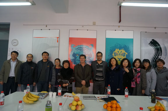 布鲁姆和卡尔豪恩教授首先来到视觉传达设计学院第六工作室进行了交流。侯立平副院长首先介绍了视觉传达设计学院的基本情况,就我院的教学情况、课程设置、国际交流情况进行了说明;斯蒂文 F.布鲁姆院长介绍了该校的教学规模、学科设置、学生作品及教师结构等情况,双方就下一步的交流合作模式进行了深入的探讨,畅谈未来的合作计划,就项目互动教学、师生互派、远程教学、展览交流等问题达成了初步合作意向,希望通过今后的交流活动进一步推动两校的专业建设和教学实践,促进中美两国文化的互动与交融。
