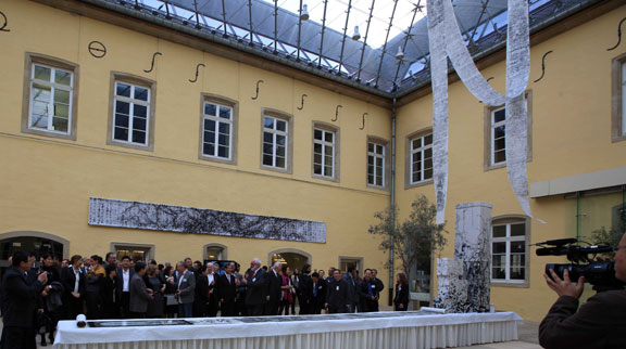 卢森堡文化部名誉总干事、新明斯特文化中心主席Guy Dockendorf,中国艺术研究院副院长王能宪,瓦隆-布鲁塞尔国际、欧盟文化中心合作组织副主席Charies-Etienne Lagasse,卢森堡文化大臣Octavie Modert对作品给予了高度评价。奥地利维也纳城市创意机构基金主任Sabine Hofmann,英国艺术策略总经理Anders Petterson,艺术创意装置工作坊策展人Didier Samiani,德国慕尼黑Meta剧院的创立者和艺术总监Axel Tangerding,中国驻卢森堡大使馆参赞Chen Yaou,中国艺术研究院党委副书记杨帆,中国艺术研究院音乐研究所所长田青,中国美术学院设计学院院长王雪青,中央美术学院建筑学院院长吕品晶,中央美术学院美术馆馆长王璜生,清华大学美术学院副院长包林,四川美术学院教授杨仁敏,《中国摄影家》杂志社社长李树峰,中国艺术研究院《文艺研究》造型艺术编辑室主任金宁等出席了展览开幕式,并对装置艺术作品《卷·语》主题性的阐释和表达进行互动探讨。