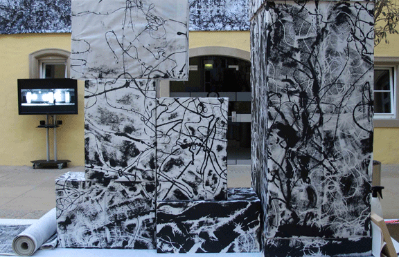 《书之象》由《漠·墨》、《摹秦李斯峄山碑帖》、《被拆解的汉字》、《卷·语》四组作品组成。其中,装置艺术《卷·语》是王瑞青根据第四届中欧文化论坛主题在近一周时间现场创作。这些作品皆运用中国最传统的拓印工艺作为媒介,将传统拓书与当代水墨和装置结合,由静到动,由古典到当代,由平面到立体,对书法古典文本进行重新解读和解构,对当代水墨的抽象绘画语言进行了深层次的探索和研究,探讨了传统拓印技艺对当代水墨创作的积极作用及水墨创作的多种可能性。作品主题皆以“象”贯穿始终,可解析为“象中象——书法的传统”、“生万象——书法的意蕴”、“象非象——书法的未来”三部分,以此喻示书法乃至传统文化的意蕴流转。正如科技比较发达的今天,形形色色的电子技术正快速取代传统书写方式,握笔书写正在被键盘敲击所代替,书写正以一种审美的形态呈现在人们的日常生活中。《书之象》系列作品正是启示观众对新文化情境中传统文化元素进行再认识。