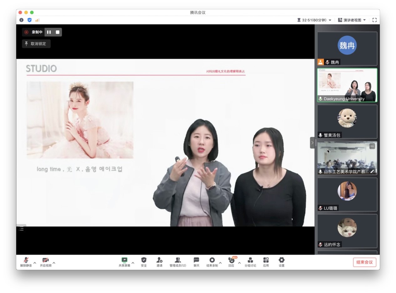 6月16日,韩国大庆大学妆扮专业李阳阳教授在线为青岛基地时尚设计学院艺术设计(妆扮)《婚礼形象设计》《毕业专题设计》课程进行专题讲座。时尚设计学院教师赵炜璐、魏冉全程参与,韩方侯丽兰老师合作辅助教学。