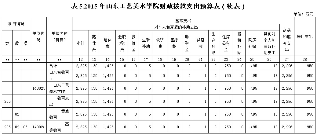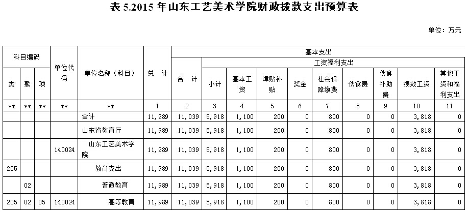 2015年财政拨款支出预算为11989万元,均为教育支出普通教育支出,主要用于工资福利支出、对个人和家庭的补助支出、商品和服务支出和项目支出。