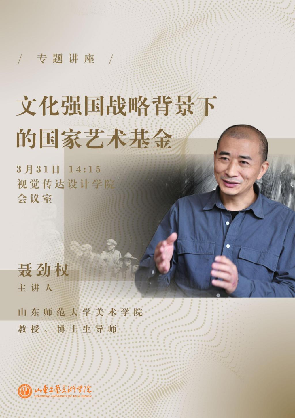 3月31日,视觉传达设计学院邀请山东师范大学美术学院聂劲权教授举办《文化强国战略背景下的国家艺术基金》专题讲座。院长王晓峰主持讲座,视觉传达设计学院教师代表参加讲座。