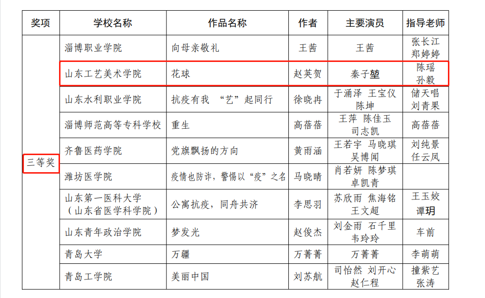 高校“公寓故事”主题系列活动由山东省教育厅、山东省教育发展服务中心和山东省学校后勤协会联合主办,为高校展现公寓文化建设水平和育人质量提供了平台。视觉传达设计学院学生赵英贺、崔慧、王浩然参演,陈瑶、高畅老师指导的作品《一起向未来》,荣获“公寓的故事”文艺展演一等奖;视觉传达设计学院学生秦子堃、赵英贺参演,陈瑶、孙毅老师指导的微电影《花球》,荣获比赛三等奖。