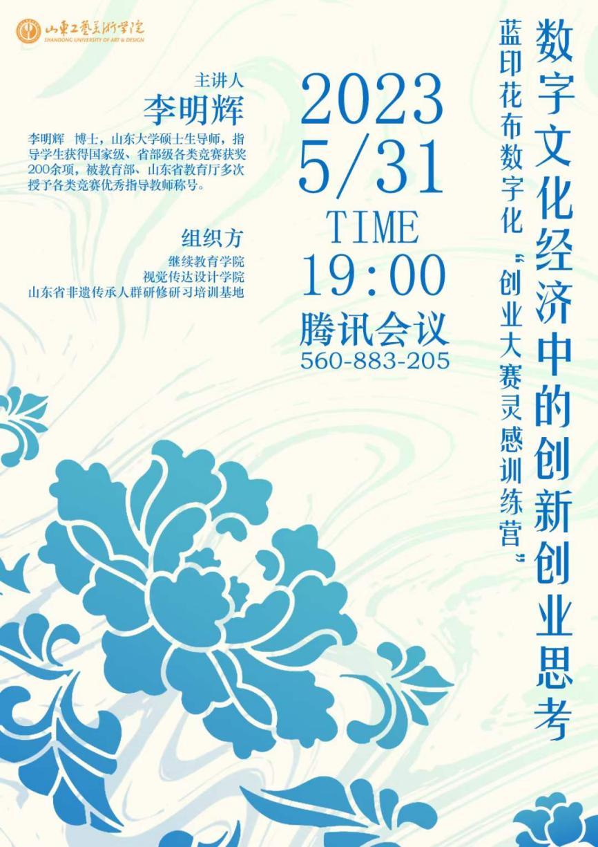 2023年5月31日晚,继续教育学院、视觉传达设计学院、山东省非遗传承人群研修研习培训基地联合举办“蓝印花布数字化创新创业训练营——数字文化经济中的创新创业思考”线上讲座。讲座由山东大学李明辉博士担任主讲,由山东交通学院张青教授主持。
