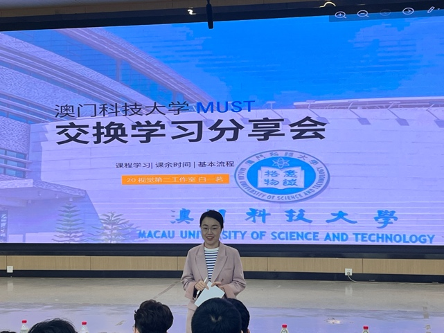 2023年5月30日下午,澳门科技大学交流学习分享会在学校第一阶梯教室成功举行。白一茗同学担任活动主讲人,与大家分享她为期五个月的澳门科技大学交流学习经验。本次活动由学校学生交流项目负责人国际交流合作处常胜男老师和视觉传达设计学院张瑞教授组织。