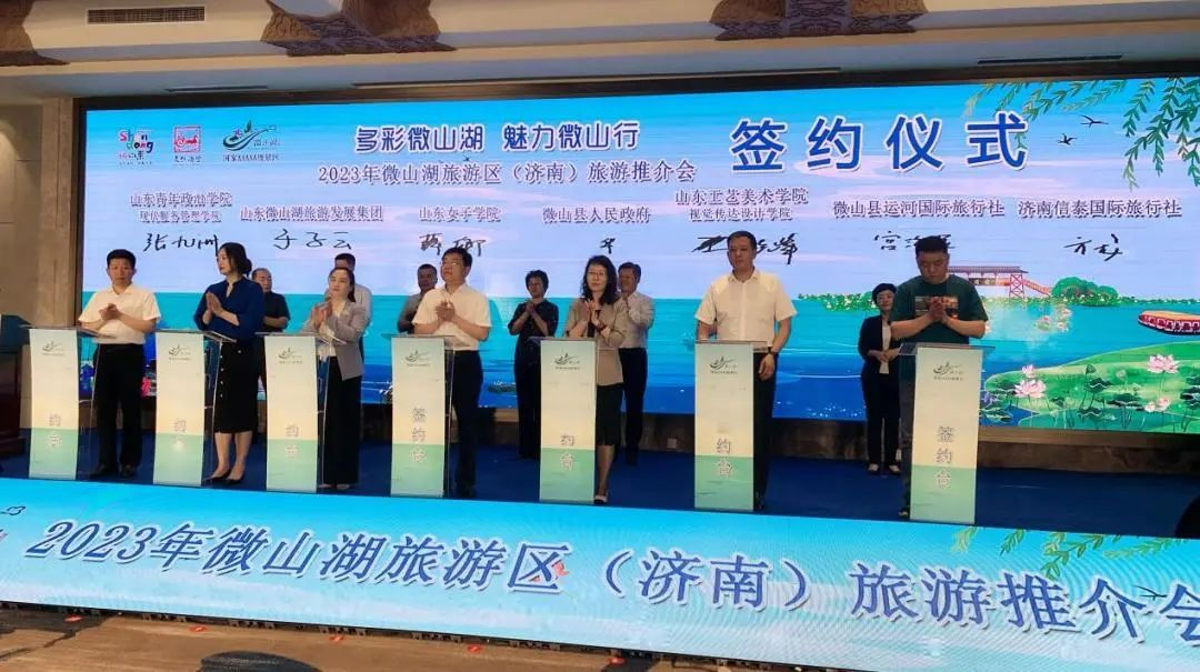 2023年6月3日上午,视觉传达设计学院与山东微山湖文旅发展集团框架合作签约活动在济南舜耕山庄举行。此次签约活动作为2023年微山湖旅游区(济南)文旅推介会重要议程,微山县委副书记、县长郭鑫、视觉传达设计学院院长王晓峰出席签约活动。