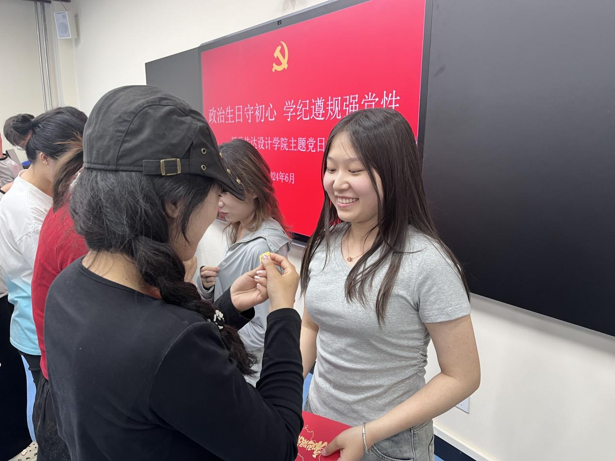 活动第三个环节,由正式党员为本次转正的学生党员佩戴党徽。