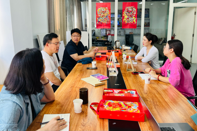 座谈会伊始,视觉传达设计学院副院长张培源、包装设计与工程教研室张瑞教授与CHC慧海创始人于涛、雷冬丽以及济南继东彩艺创意设计有限公司总经理张世颖就“访企拓岗”行动进行了深入交流。通过前期走访、讨论交流,学院不仅了解了当前设计行业的最新动态和市场需求,还与企业建立了更加紧密的合作关系。随后,与会嘉宾就校企联合课程开发、学生实习实训等方面提出了宝贵的意见和建议。