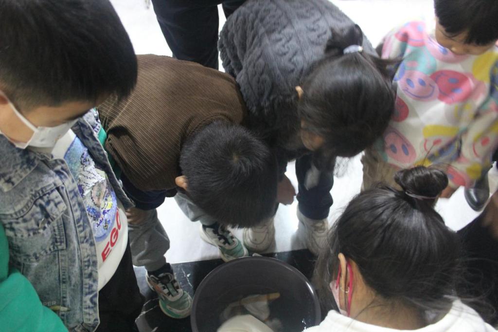活动伊始,服装学院志愿者们仔细讲解了扎染的发展历史、基本扎染技法、步骤以及扎染所需的各类制作材料并进行了扎染演示,参加活动的小朋友们兴趣浓厚,听得津津有味。活动中,志愿者们耐心地指导小朋友们扎结手法、染色技巧。等待结果的过程是期待又兴奋的,当小朋友们围在一起解开扎染的绳子后,脸上露出的真挚笑容,就是我们此行最大的目的。