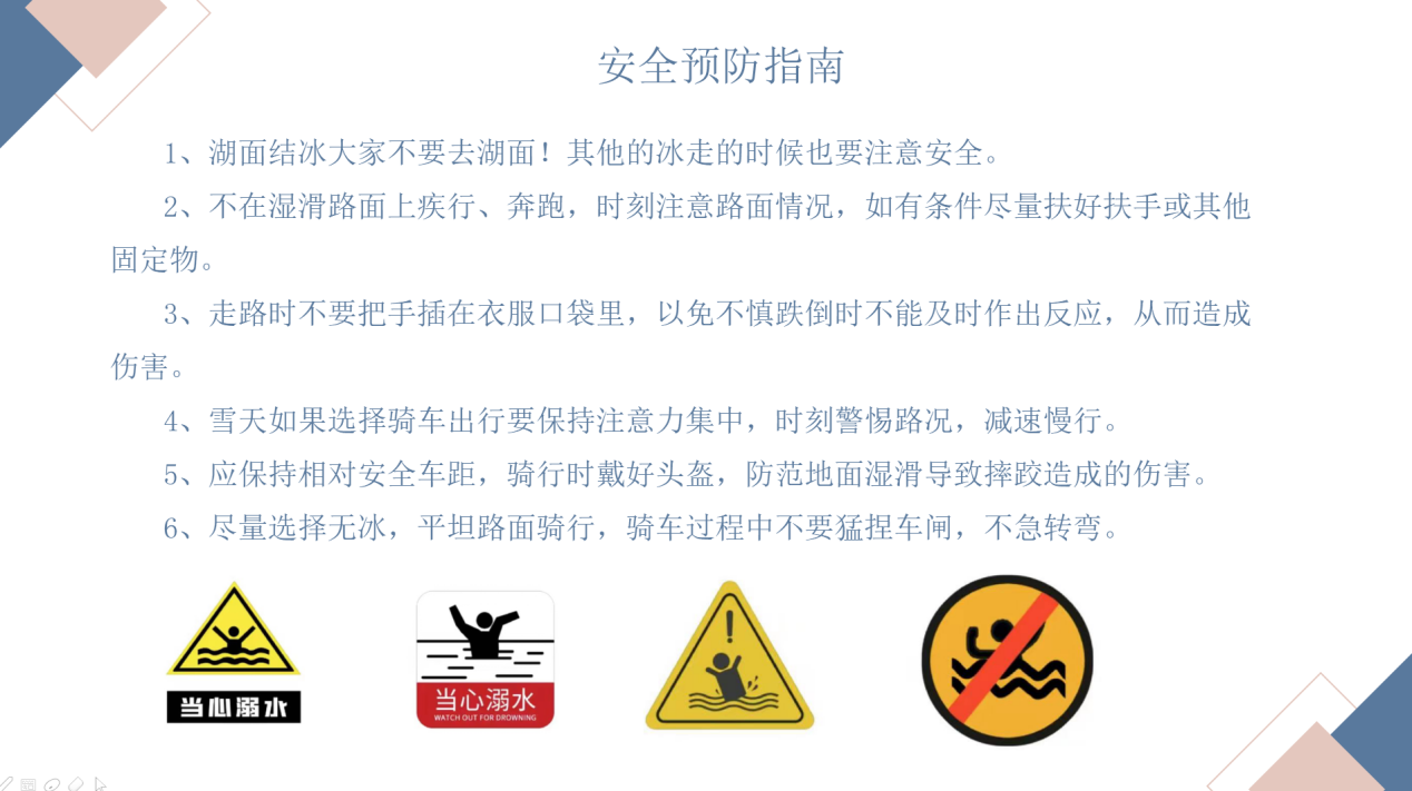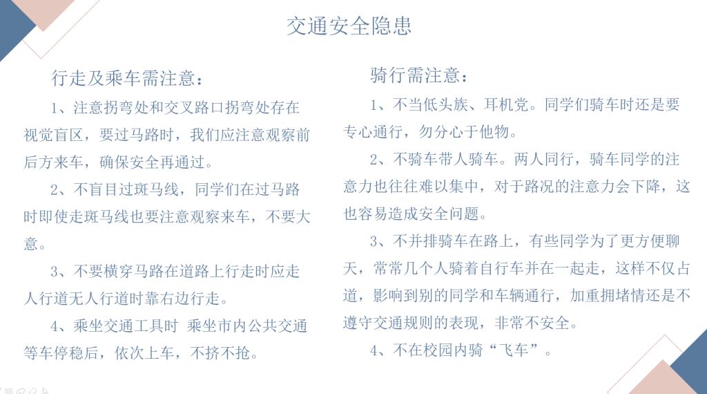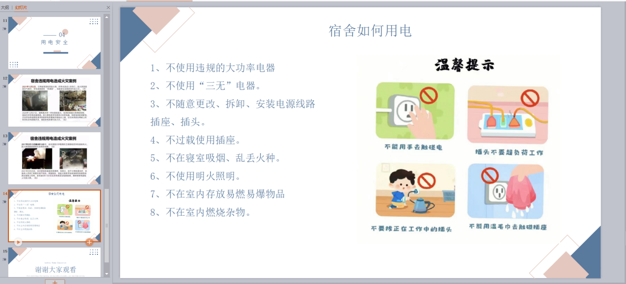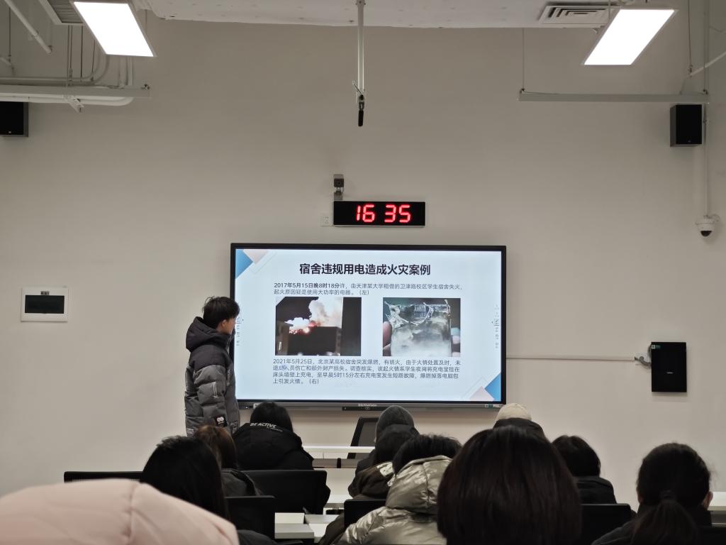 班会由学院统一制作安全主题教育课件,各班班委组织学生开展,讲解相关安全知识。班会内容涵盖了火灾预防、交通安全、人身安全、宿舍安全等方面,旨在帮助学生了解各种安全风险,掌握应对策略,从而引导广大同学,提高安全意识,增强安全防范能力,切实保障学生的人身和财产安全。