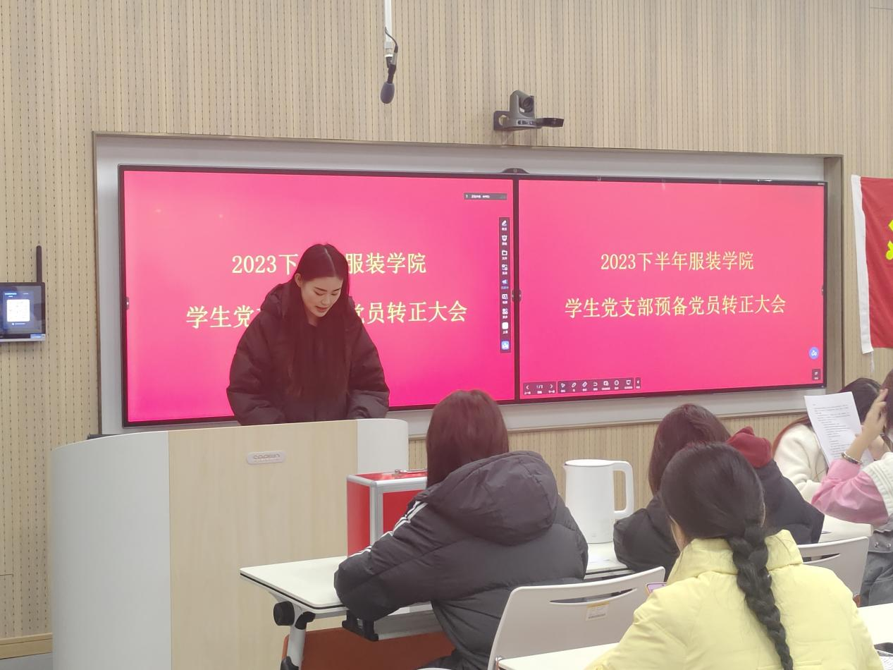 2023年12月28日,服装学院党总支学生党支部在多媒体教室召开中共预备党员转正大会,研究张仲妹,张天慧,梁泽昌,高贺巧4位同志预备党员转正事宜。本次会议由党支部书记刘怡宏主持,学生党支部全体师生党员参加会议,党总支书记杨磊、专职组织员任泽列席会议。