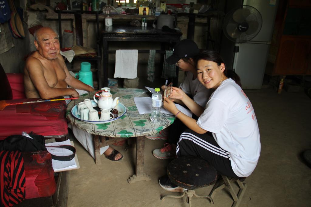 测绘完成后,团队成员在村中积极寻找工匠,进行工匠访谈口述史工作。团队成员从民居建筑营造尺度,建筑营造习俗,建筑构造方式,建筑营造原材料,建筑设计原由,工匠动工拜师习俗等方面出发,对工匠进行口述史访问,力求获得最原始的民居营造理念,工艺制作技巧的信息。在当地村委的帮助下,本次岈山村民居口述史工作进行较为顺利,团队成员稇载而归。
