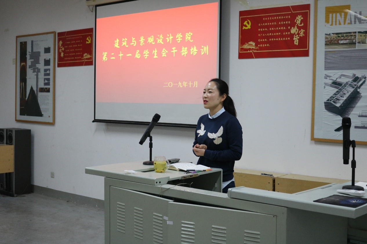 10月30日下午,建筑与景观设计学院学生会在长清校区综合办公楼多媒体教室开展第二十一届学生会干部培训。建筑与景观设计学院党总支副书记娄彦担任本次培训的主讲,建筑与景观设计学院学生会主席团和各部部长、副部长参加了本次培训。
