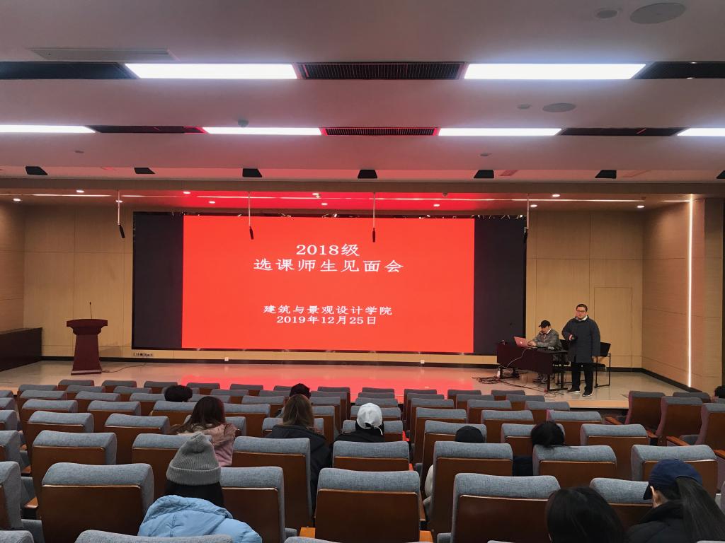 2019年12月25日上午9:00,建筑与景观设计学院在第一阶梯教室举办2018级选课师生见面会。见面会由建筑与景观设计学院副院长胡英盛主持,27位任课老师和2018级全体新生参会,为2019-2020学年第二学期的选课工作做好准备。