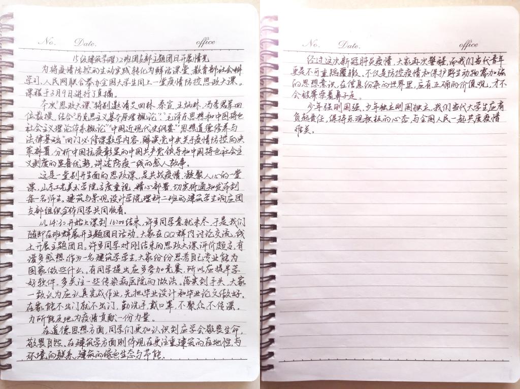 2017级建筑学二班孔静芝:习近平总书记指出,这次抗击新冠肺炎疫情,是对国家治理体系和治理能力的一次大考。而我觉得,这同时也是对我们团员青年的一次考验,我们应当在疫情期间展现应有的担当。作为新时代的大学生,我们要坚持党的领导,配合组织工作;响应学校号召,进行网络课学习;积极参与宣传创作,服务社会,传递正能量。
